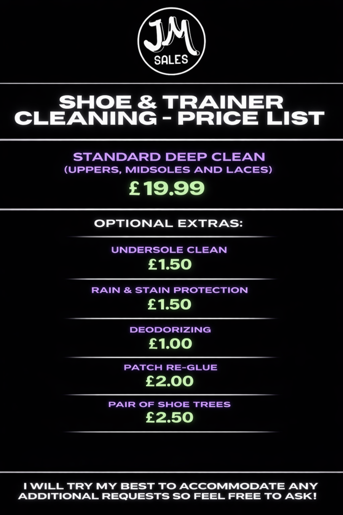 I now offer a shoe and trainer cleaning service so if you’ve got a pair of kicks that need a little pick-me-up or a major restoration, send them my way and I’ll get them back to their former glory! 👟
